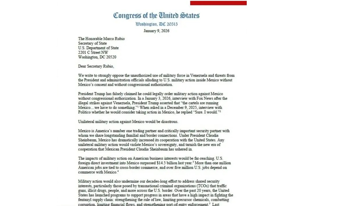 Un grupo de 75 congresistas de Estados Unidos manifestó su rechazo a las referencias del presidente Donald Trump y de integrantes de su administración sobre la posibilidad de acciones militares dentro de México sin el consentimiento del Gobierno mexicano ni la autorización del Congreso estadounidense. La postura fue expresada mediante una carta dirigida al secretario de Estado, Marco Rubio, en la que los firmantes califican de “enérgica” su oposición a cualquier uso no autorizado de la fuerza.