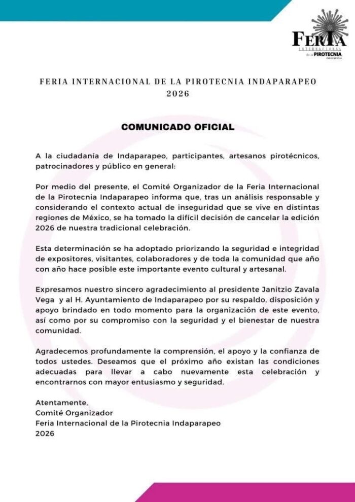 La Feria Internacional de la Pirotecnia de Indaparapeo, uno de los eventos culturales y artesanales más representativos de la región, fue cancelada ante el contexto de inseguridad que se vive en distintas zonas del país. Así lo informó el Comité Organizador mediante un comunicado oficial, en el que explicó que la decisión se tomó tras un análisis responsable y priorizando la seguridad e integridad de expositores, visitantes, artesanos pirotécnicos, patrocinadores y de toda la comunidad que año con año hace posible esta celebración.