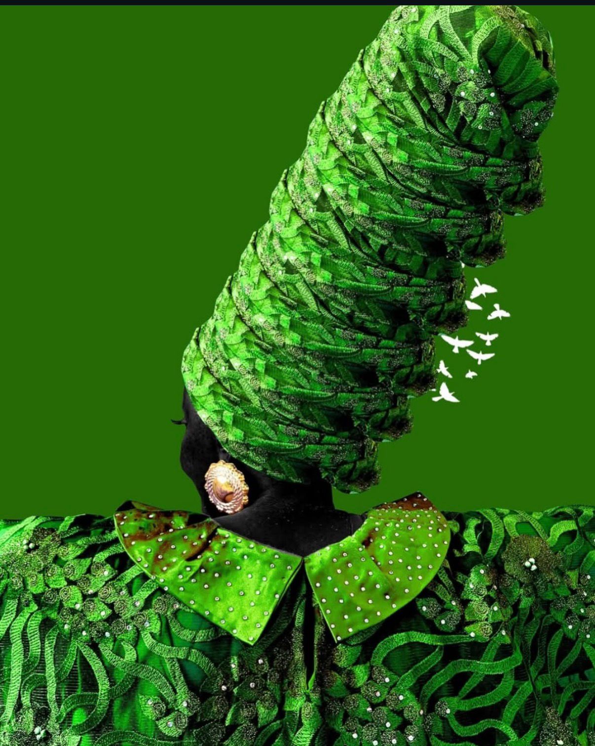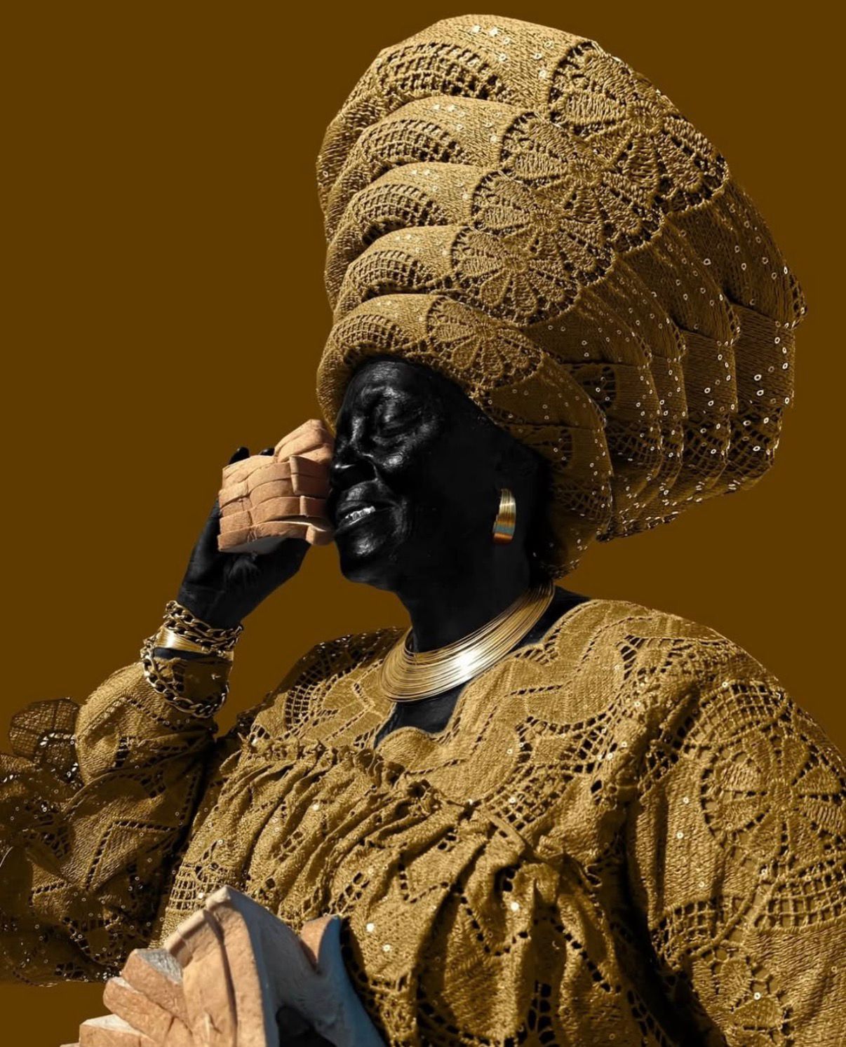 Sus retratos no buscan la fidelidad documental. Son composiciones escénicas en las que las personas aparecen como figuras simbólicas, casi escultóricas, envueltas en telas, encajes, tocados y colores intensos que remiten directamente a tradiciones yoruba. Cada elemento está cargado de historia: los tejidos hablan de linaje, los accesorios de dignidad, las posturas de presencia. La fotografía funciona aquí como punto de partida, no como límite.