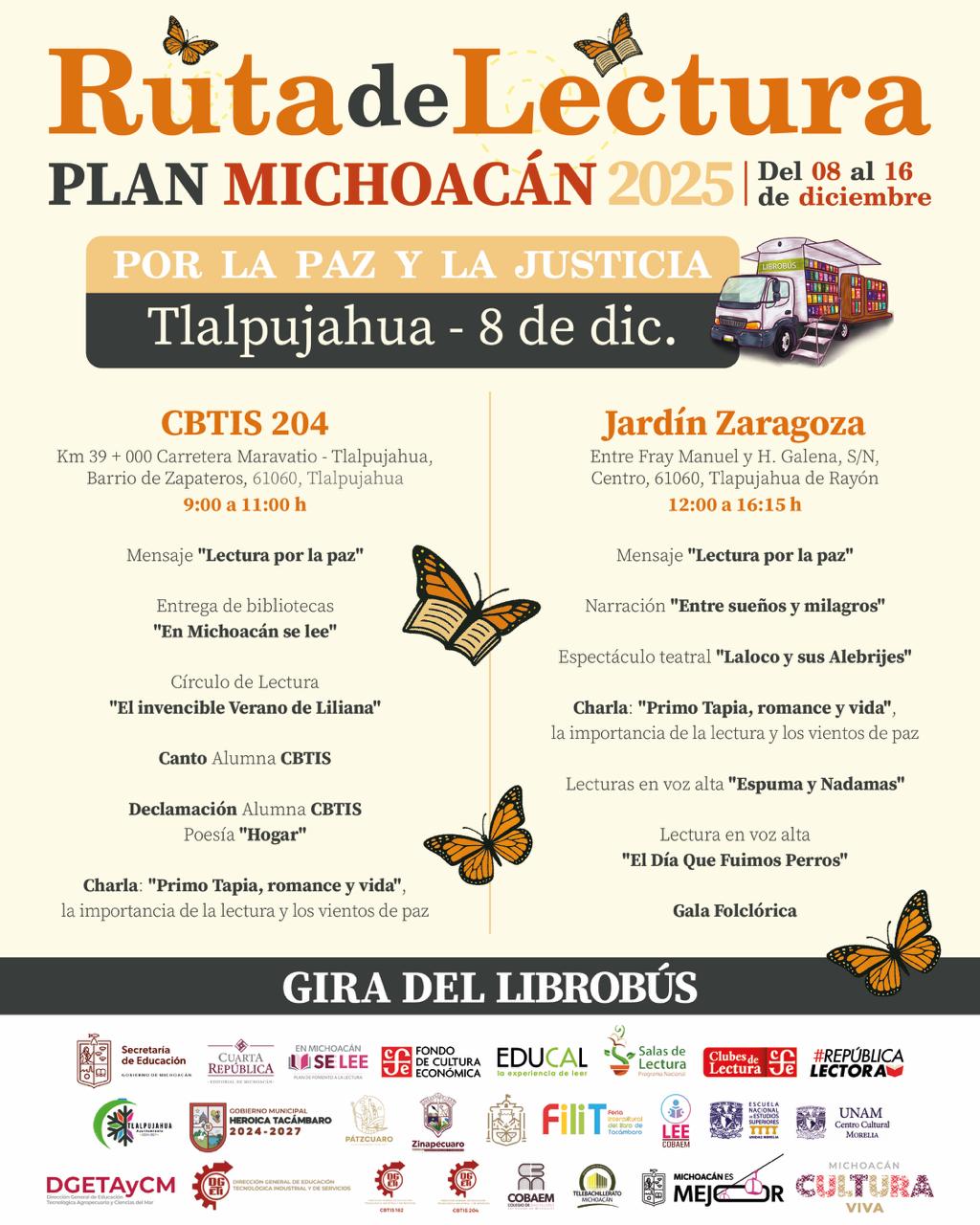 Las actividades comenzarán el 8 de diciembre en el CBTIS 204, de 9:00 a 11:00 horas, con el mensaje “Lectura por la paz” y la entrega de bibliotecas del programa En Michoacán Se Lee. Se realizará un círculo de lectura centrado en el libro “El invencible verano de Liliana” de Cristina Rivera Garza, además de actividades de declamación, canto y una charla sobre el valor de la lectura y la construcción de paz.