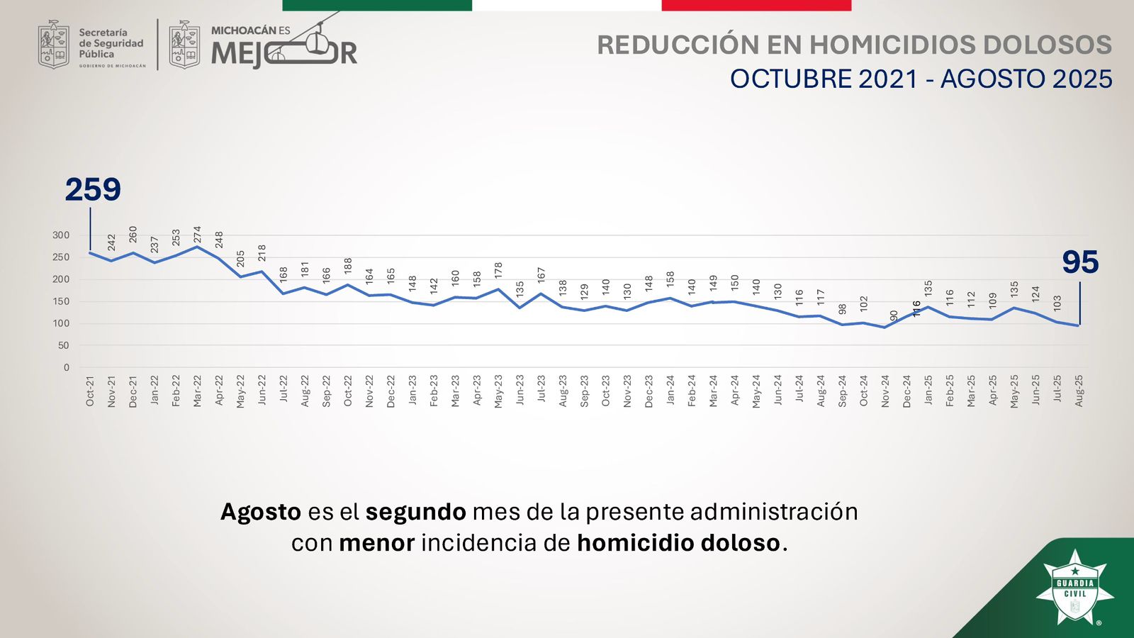 En Michoacán, el mes de agosto cerró con 95 homicidios dolosos, lo que representa la segunda cifra más baja en lo que va de la presente administración estatal. Así lo informó el secretario de Seguridad Pública, Juan Carlos Oseguera Cortés, durante una conferencia encabezada por el gobernador Alfredo Ramírez Bedolla.