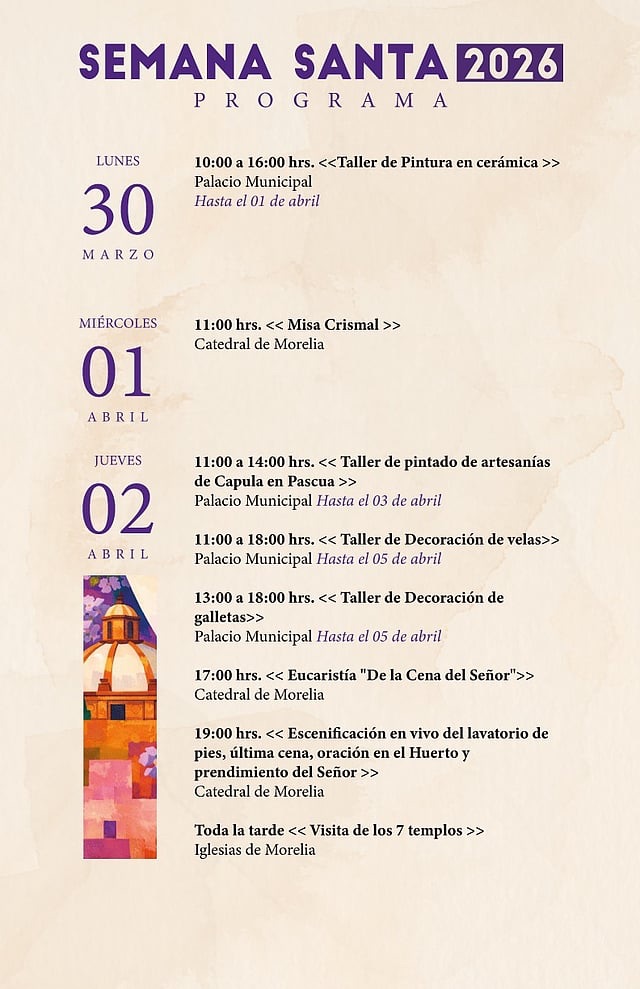 La ciudad de Morelia, Michoacán, dio a conocer el programa oficial de actividades para la Semana Santa, que se llevará a cabo del 10 de marzo al 11 de abril, con una agenda de más de 20 eventos religiosos y culturales en distintos puntos del Centro Histórico.