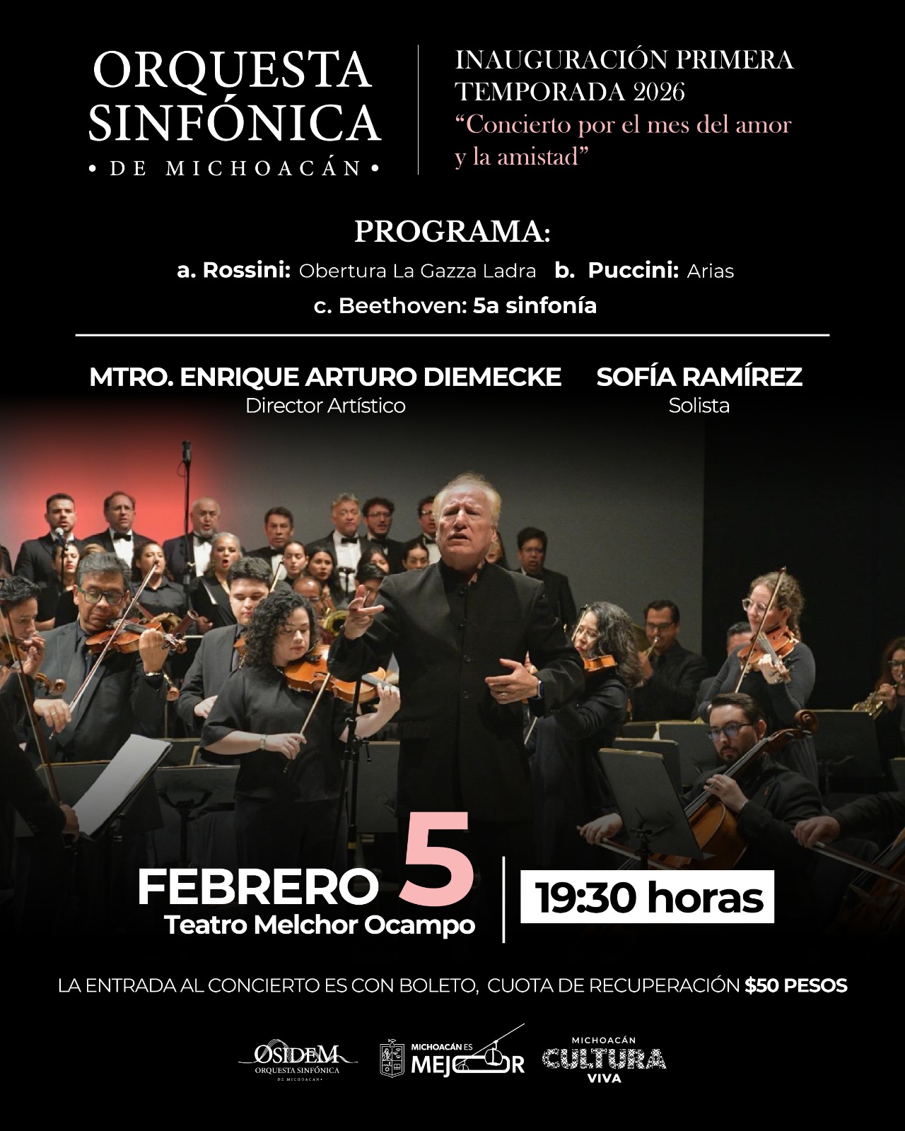 La Secretaría de Cultura de Michoacán (Secum) presentó el inicio de la temporada 2026 de la Orquesta Sinfónica de Michoacán (Osidem) con el “Concierto por el mes del amor y la amistad”, que se llevará a cabo el jueves 5 de febrero a las 19:30 horas en el Teatro Melchor Ocampo. El evento estará bajo la dirección de Enrique Arturo Diemecke y contará con la participación de la soprano mexicana Sofía Ramírez.