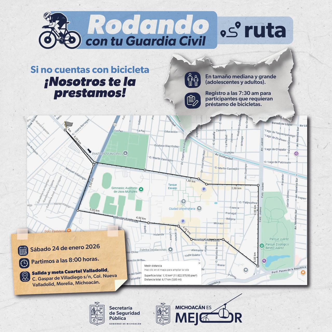 La Secretaría de Seguridad Pública (SSP) realizará el próximo sábado 24 de enero la actividad “Rodando con tu Guardia Civil”, una jornada deportiva y de convivencia dirigida a las familias michoacanas. El evento, que busca fortalecer la proximidad y confianza entre la sociedad y los elementos policiales, tendrá lugar en el Cuartel Valladolid de Morelia a partir de las 08:00 horas.