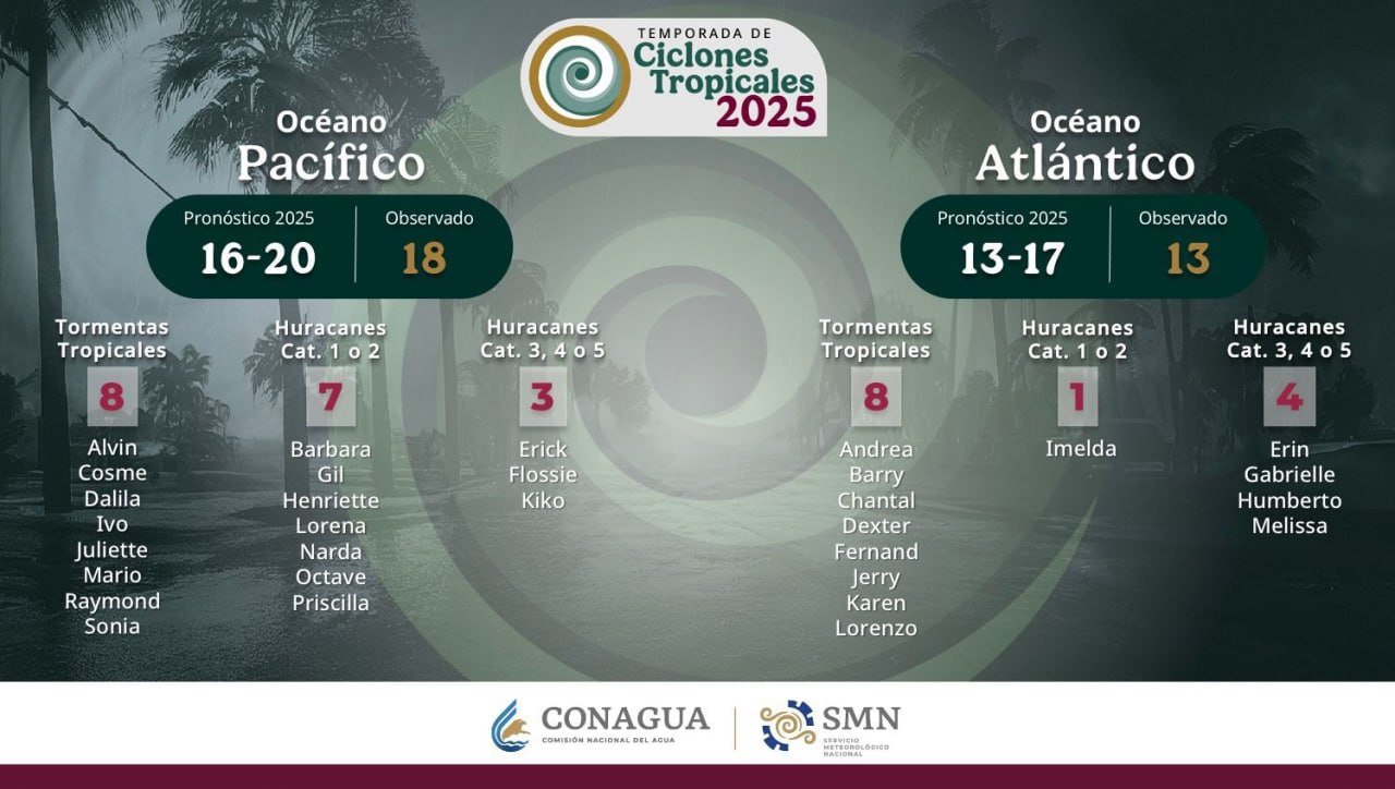 La temporada de lluvias y huracanes en México ha concluido con un registro superior a la media de fenómenos meteorológicos. Según el informe final del Servicio Meteorológico Nacional (smn), se documentaron un total de 31 ciclones tropicales: 13 desarrollados en el océano Atlántico y 18 en el Pacífico.