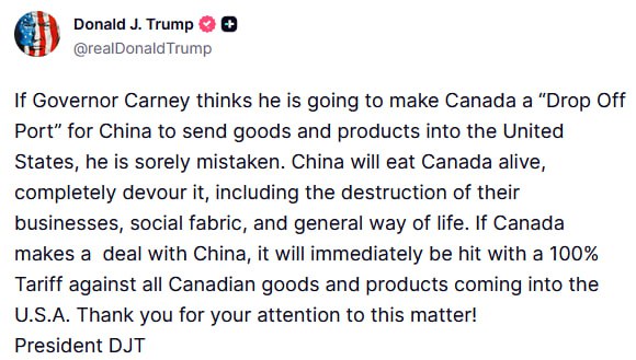 El presidente estadounidense Donald Trump advirtió que impondría un arancel del 100% a todos los bienes y productos canadienses que ingresen a Estados Unidos si Canadá llega a un acuerdo comercial con China. En una publicación en su red Truth Social, Trump afirmó que no permitirá que Ottawa se convierta en un “punto de tránsito” para productos chinos dirigidos al mercado estadounidense, y aseguró que tal cooperación podría acarrear a Canadá “la destrucción de sus negocios y su estilo de vida”.
