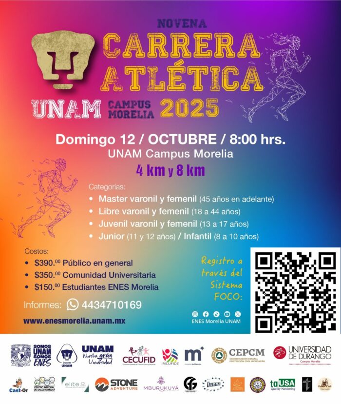 Las cuotas de recuperación para este evento deportivo serán de 390 pesos en la inscripción al público en general, 350 pesos para comunidad UNAM y 150 pesos a los estudiantes de la ENES Morelia UNAM. Los registros ya están disponibles en la plataforma https://app.enesmorelia.unam.mx/foco/carrera-atletica.